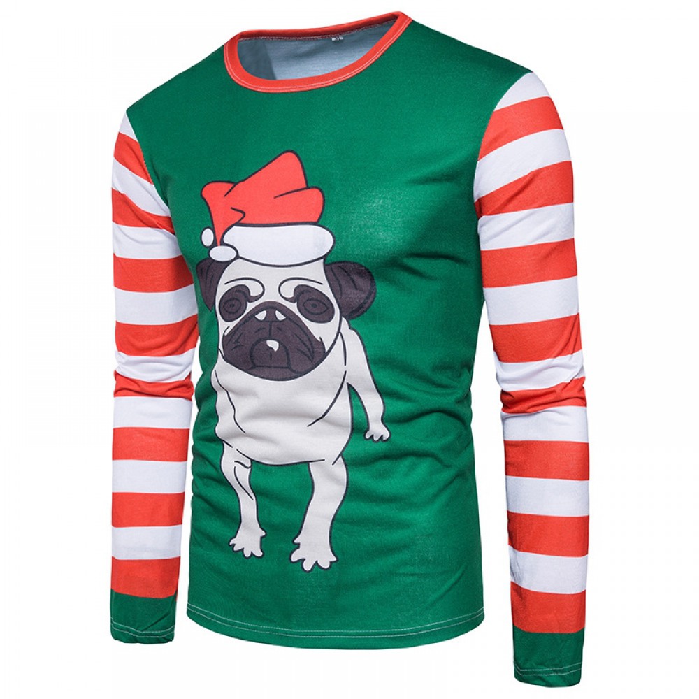 Men's New Special 3D Printing Cartoon Dog Christmas Hat Round Neck Long Sleeve T-Shirt