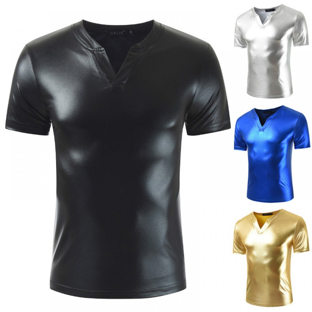 Men's T-Shirt V-Neck Solid Color Shiny Nightclub Design Dynamic Fashion Sexy Men's Short Sleeve T-Shirt